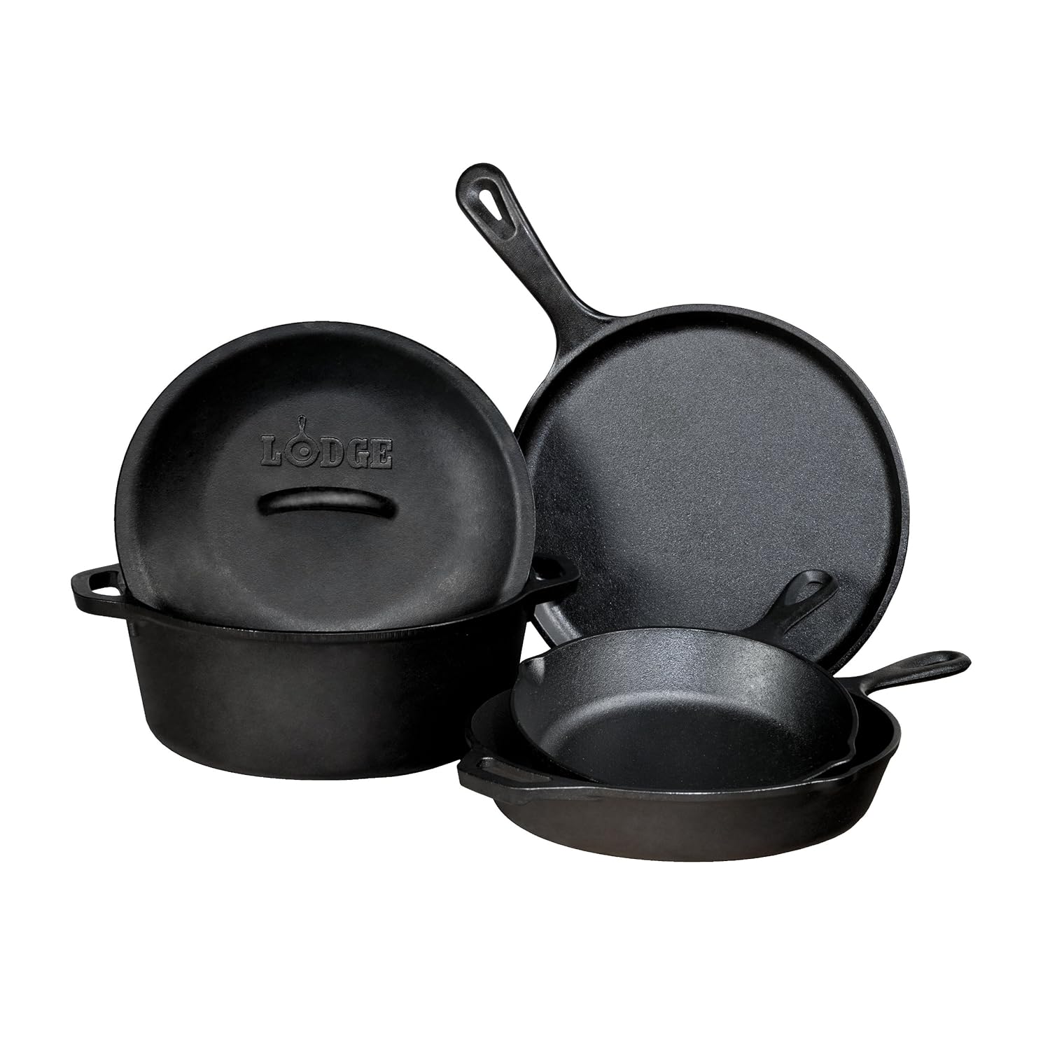 - Includes 10-1/2-Inch round griddle, 8-Inch skillet, 10-1/4-Inch skillet, 5-Quart Dutch oven and 10-1/4-Inch iron cover